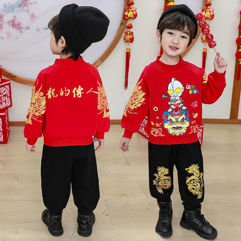 Boy winter clothing Ottmann golden dragon year gushed with suede warm suit Children's winter sweatshirt Two sets of New Year's load of New Year's fashion-Taobao
