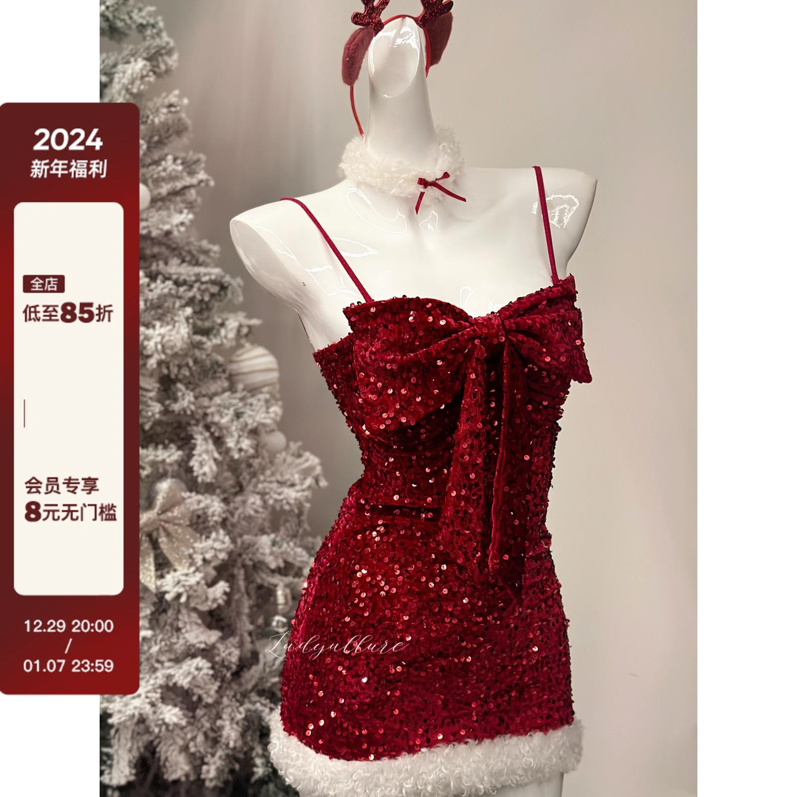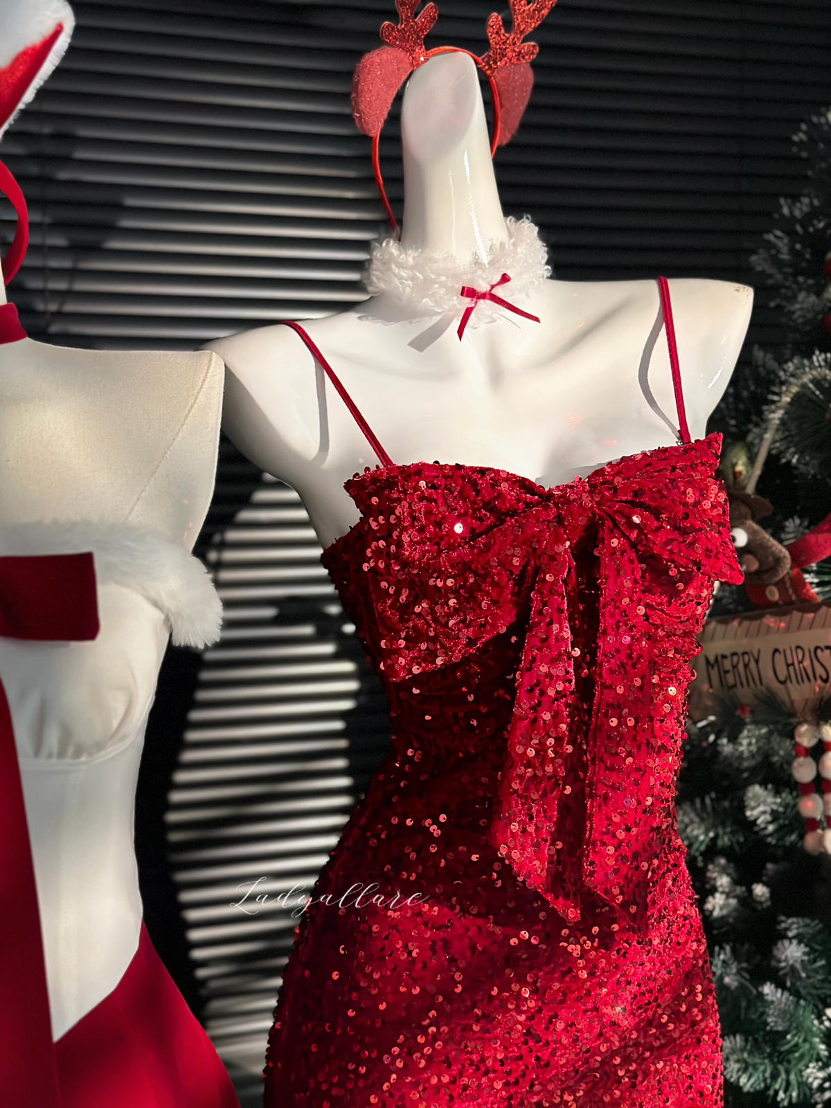 "LA" Beauty Deer Lady * Original Temperament Sparkling Red Butterfly Knot with Slim Birthday Gown Short Dress-Taobao