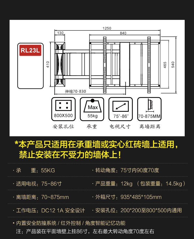 RL20 electric 37-50 inch arm 500 long 35KG RL21 electric 55-70 inch arm 600 length 45KG RL22 electric 65-75