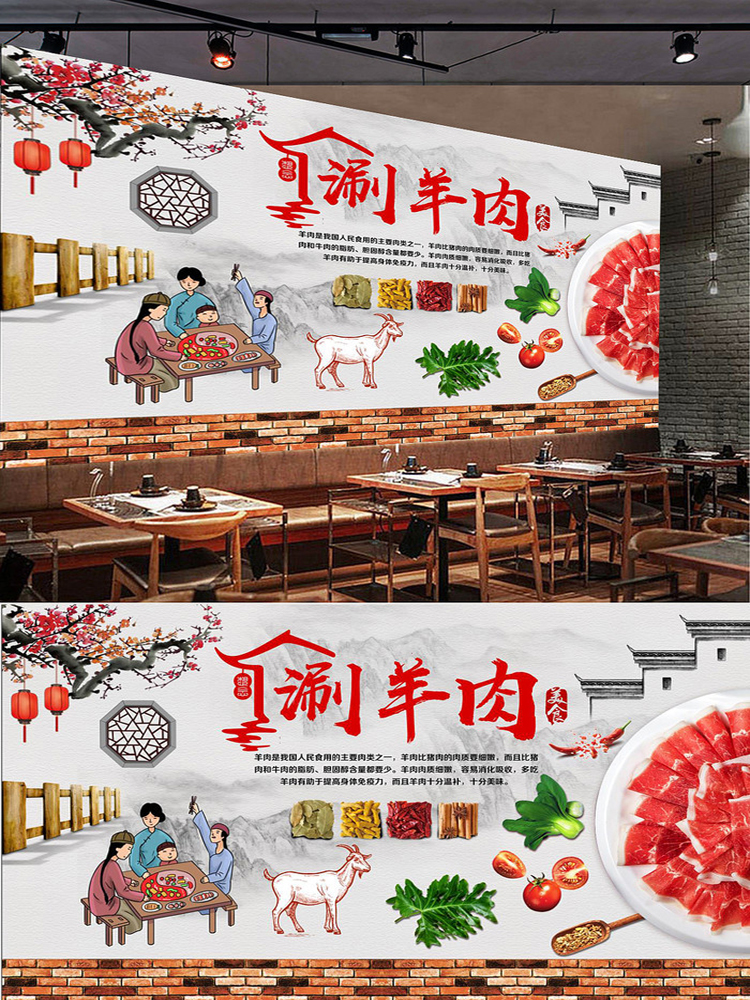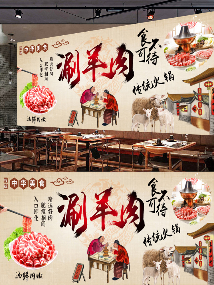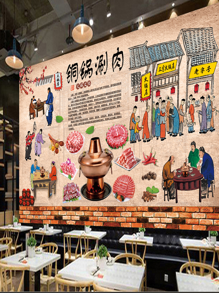 Rind Mutton Paste Painting Bronze Pot of Boiled Meat Poster Stickers Mutton Hotpot Background Wall Advertising Bronze Hotpot Wall Stick-back Glue-Taobao