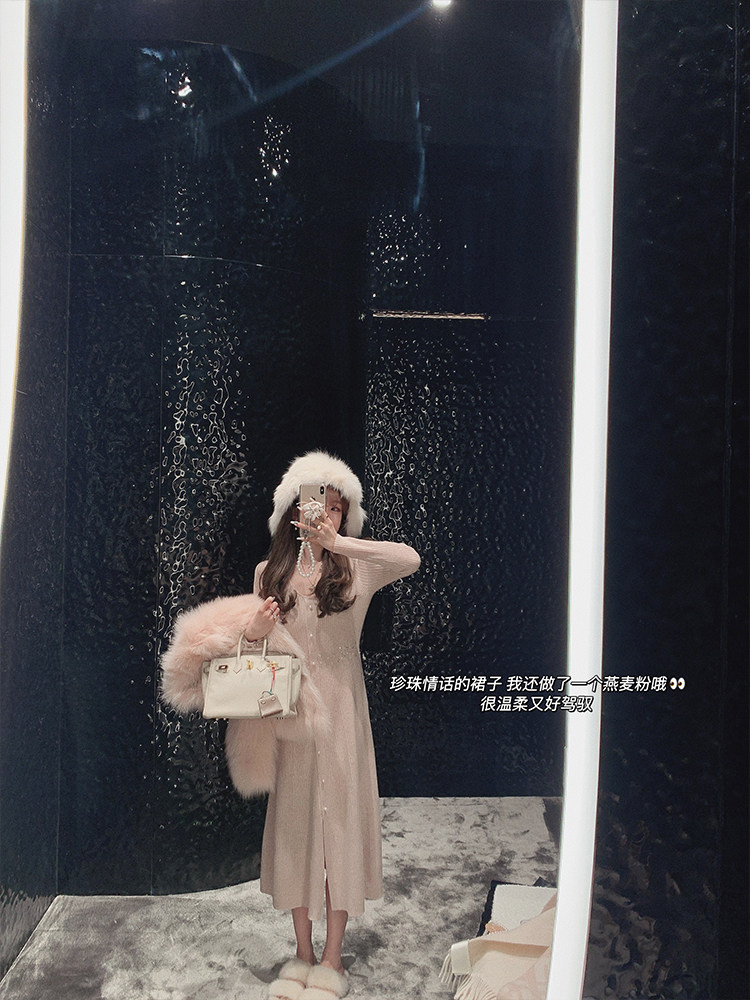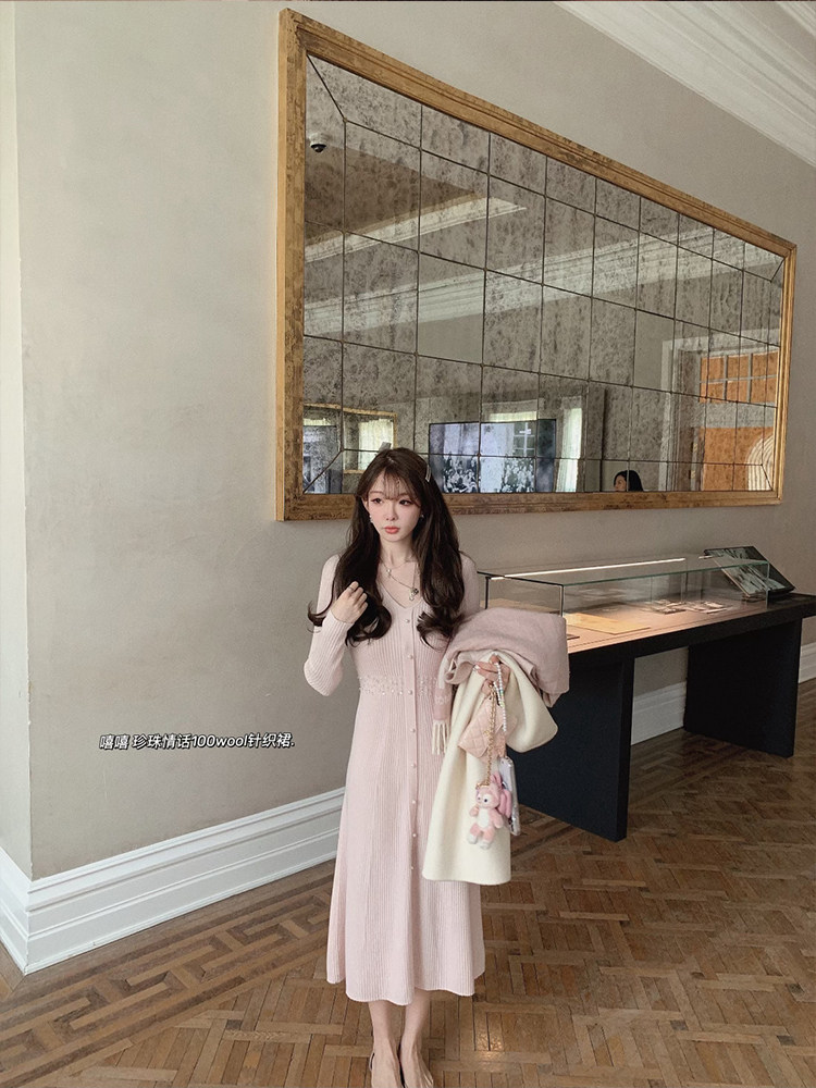 Golden Mushrooms Mushrooms About Pearls Pearl Love 100 wool V neckline Waist Knit Nepotism Dress-Taobao