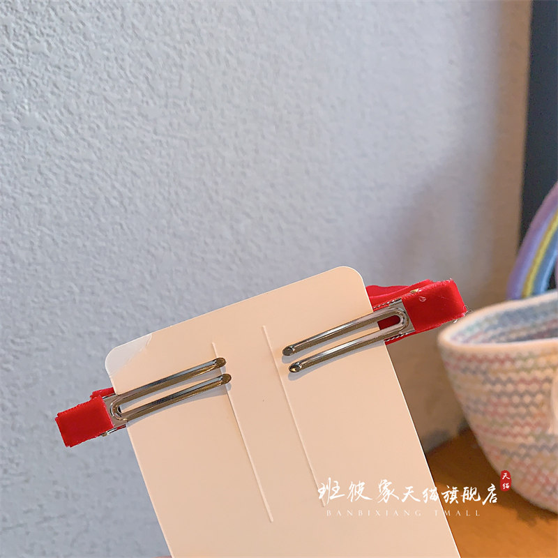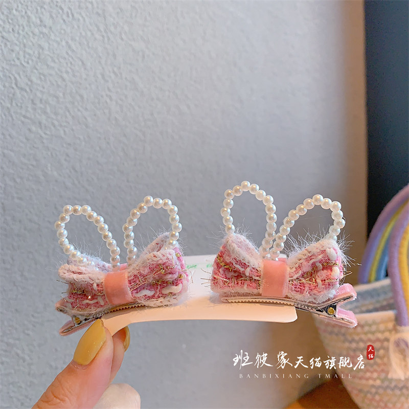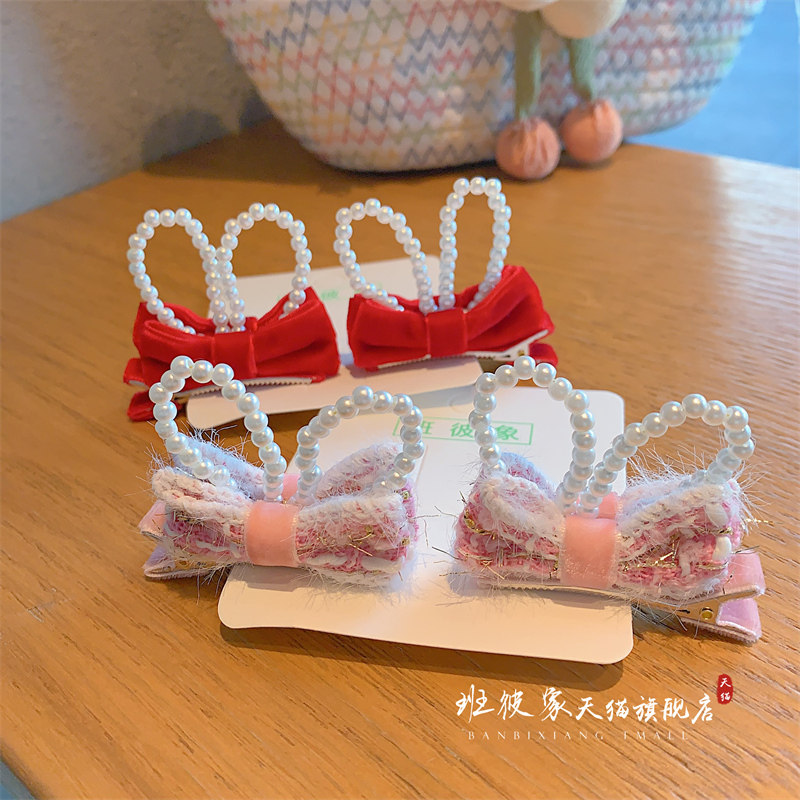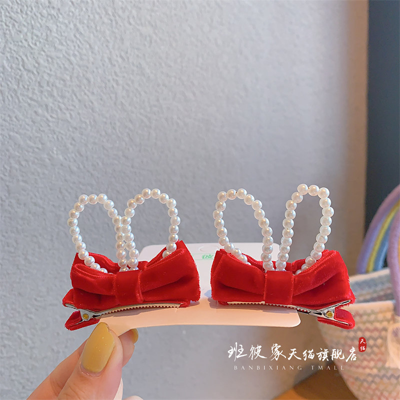 New Year Pearl Rabbit ear Child hairpin girl Cubism cute haircut girl New Chinese New Year red pair of gripping head decoration-Taobao