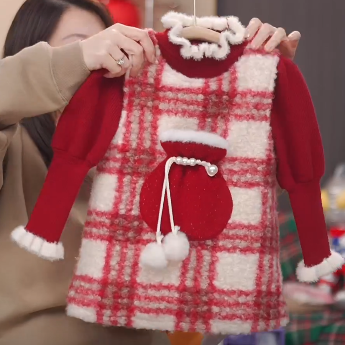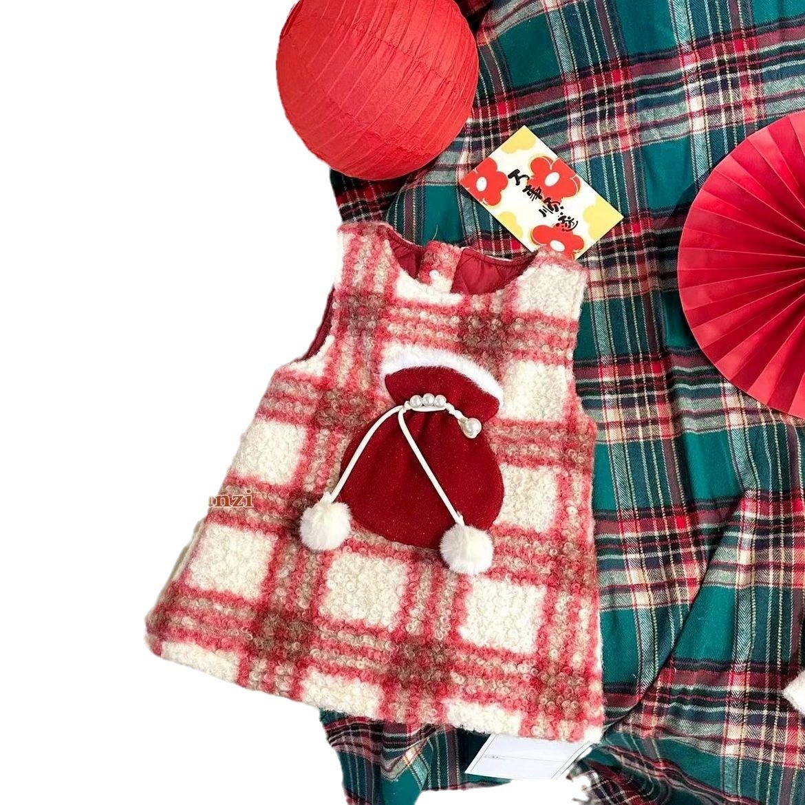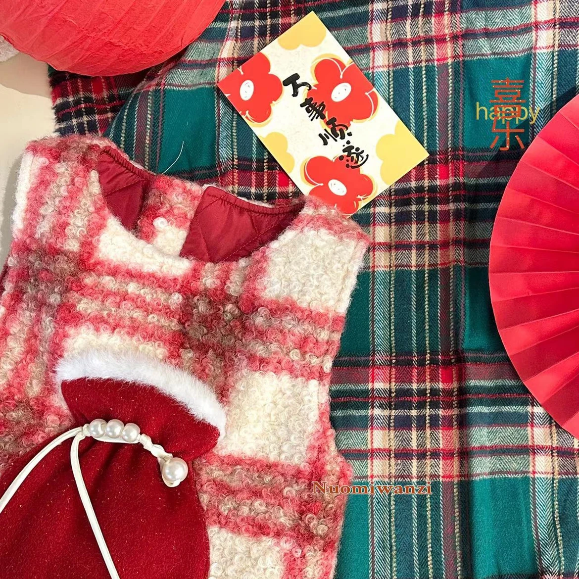 Girl's Christmas New Year dress 2023 Winter baby gush thickened wool Vest Skirt Children Plaid Dress-Taobao