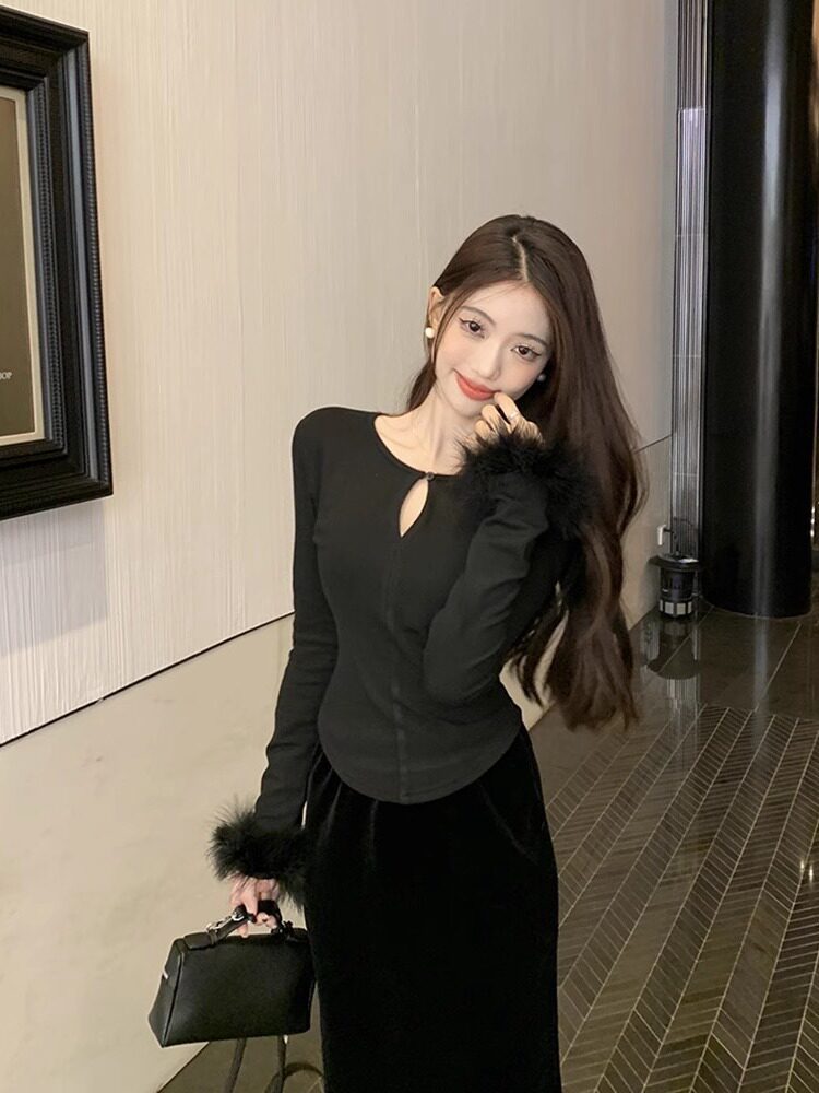 Add-down thickened milled undershirt female autumn winter inner lap jacket 2023 new fur splicing hollowed-out long sleeve T-shirt-Taobao