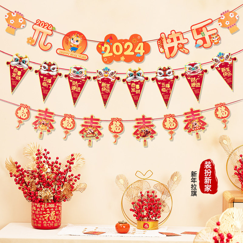 New Year 2024 Lunar New Year decorations La Flag Kindergarten Classroom New Year's Day arranged atmosphere La floral pendant with hanging decoration hanging flag-Taobao