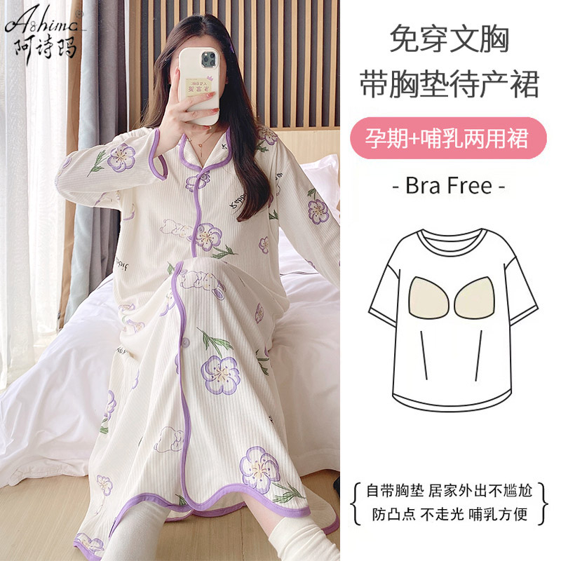 Lactation sleeping dress with chest cushion autumn and winter money Long style large code pregnant woman sleeping clothes for the winter postpartum to be produced to feed milk-Taobao