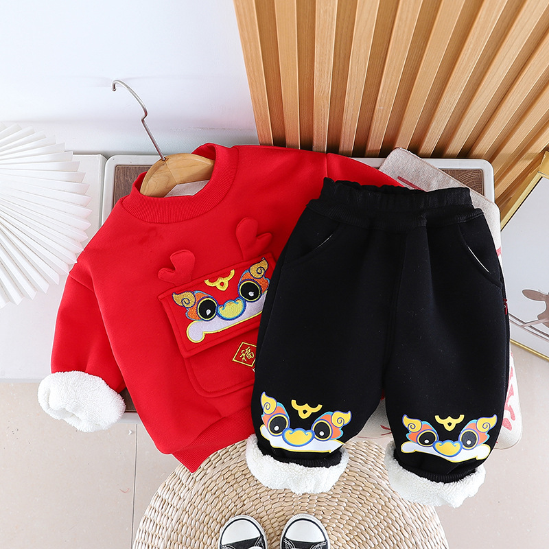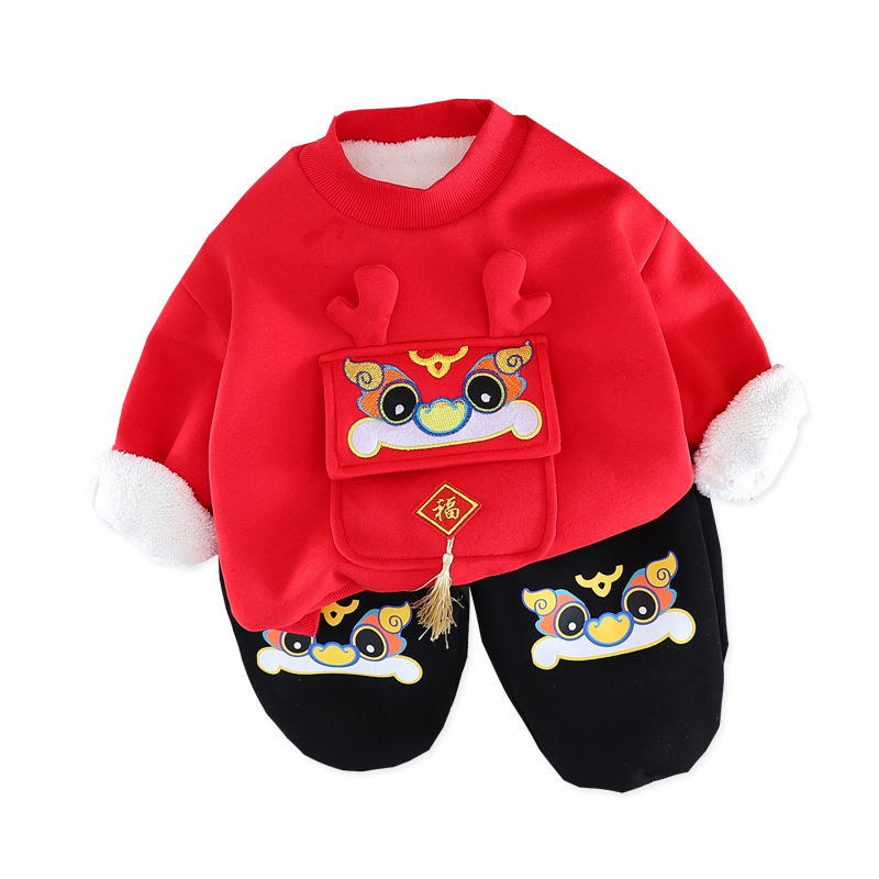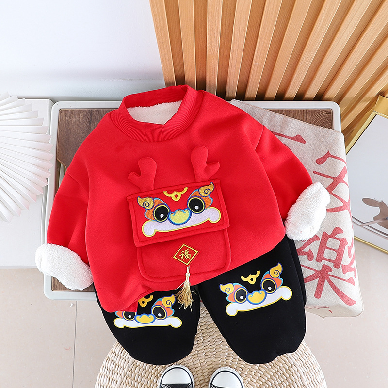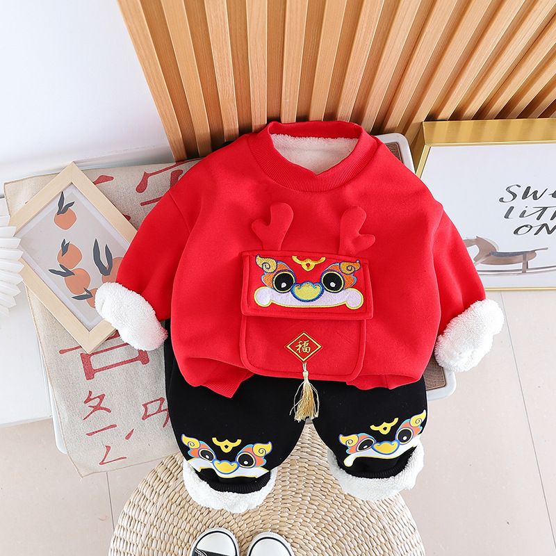 Children's baby thickened sweatshirt Chinese New Year suit suit men and women winter plus velvet festive clothing New Year uniforms Two sets-Taobao