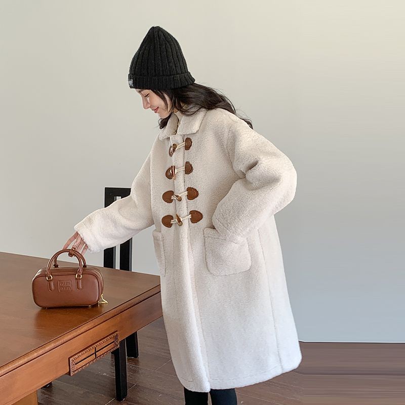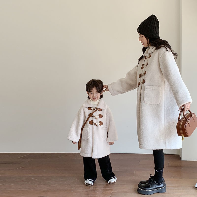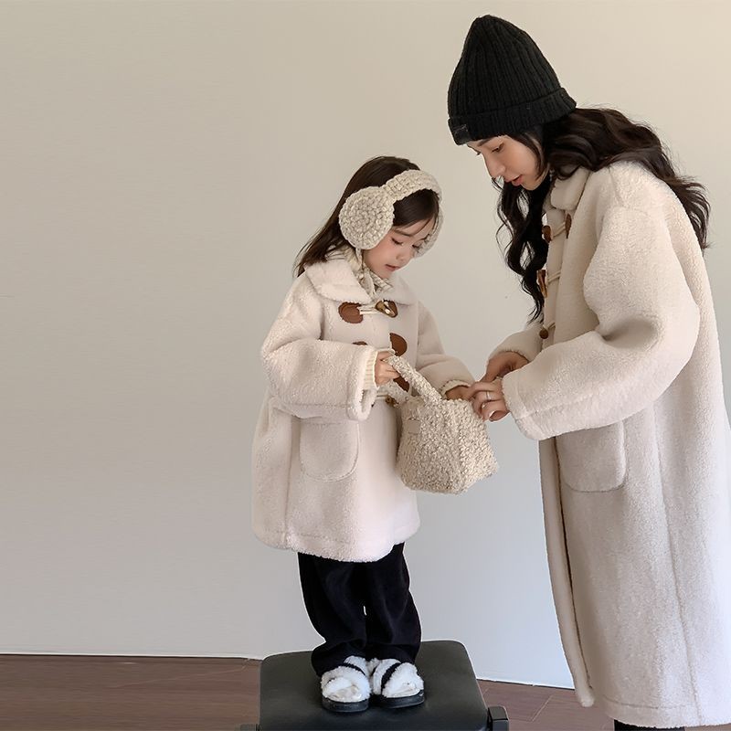 Pro-child bottling new wave winter mother and mother female dress with long lamb suede buffalo horn button windcoat Thickened Jacket-Taobao
