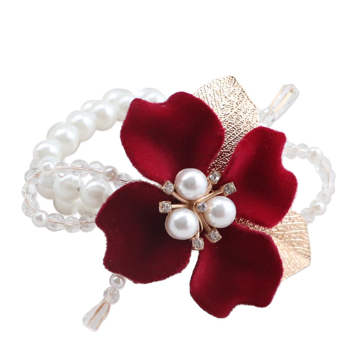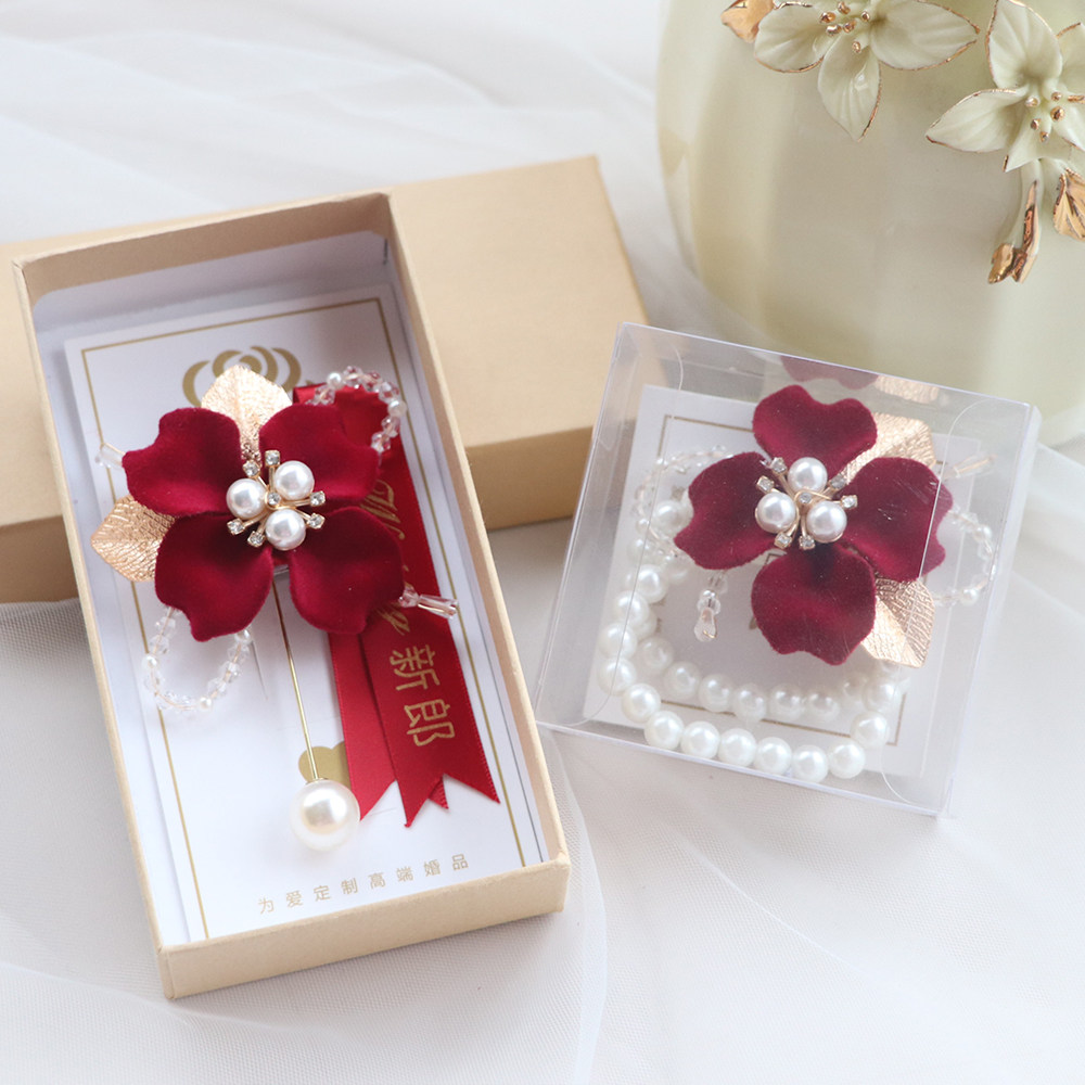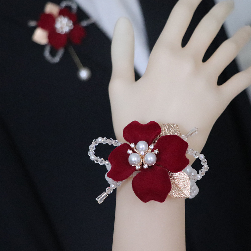 Wine Red Flocking Flowers Pearl Elastic Wrist Flowers Brides Wedding Hands bridesmaid Sister Group Bracelet Events-Taobao