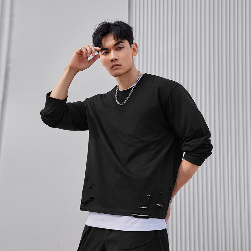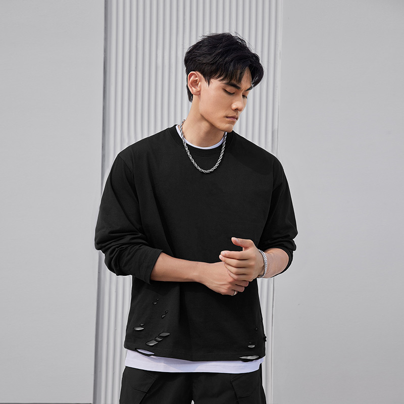 Deer House High Street Series Making Old Broken Hole Long Sleeve T-shirt Male Street Sports Fitness Big Code Casual Blouse to Bottom-Taobao