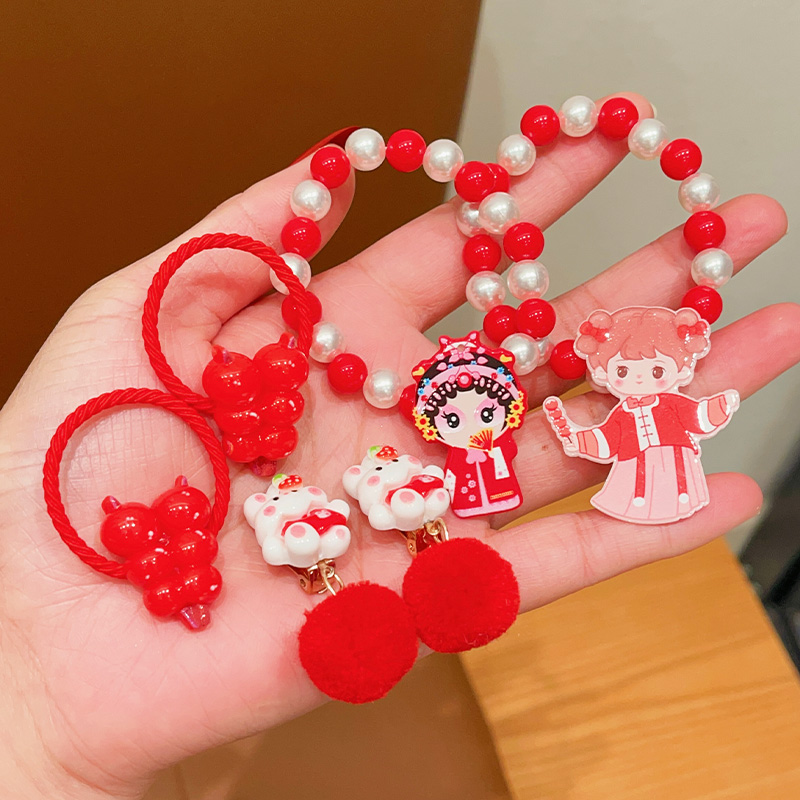 Children's New Year Bracelet Ear Clip Suit Little Girl Cute Cartoon Rubber Band Accessories Baby Red Festive Jewellery-Taobao