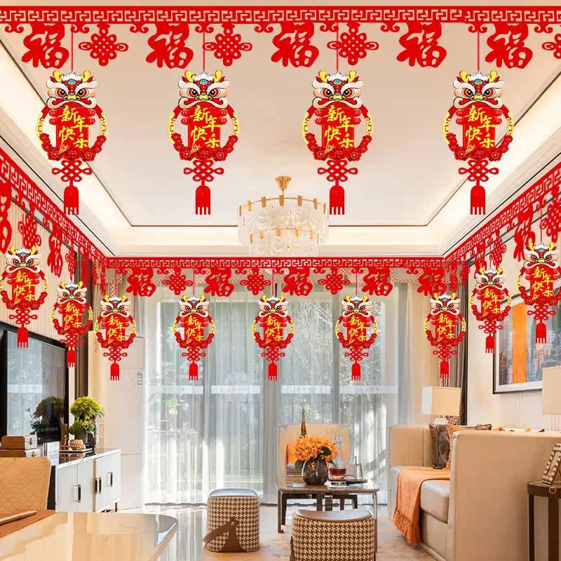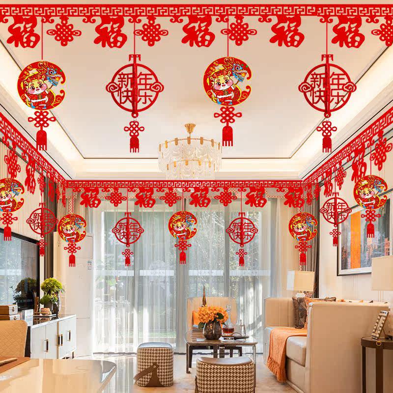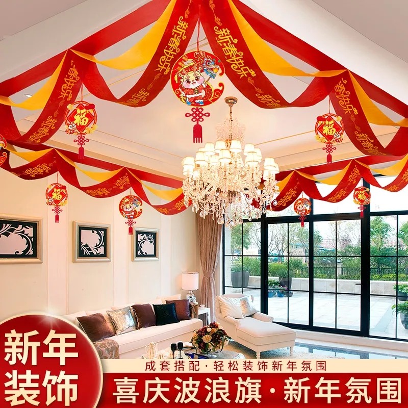 2024 Spring Festival Laurong Year's New Year's Day Living Room Shopping Mall Supermarket Decoration Arrangement New Year Fu Character Wave Banner Hanging-Taobao