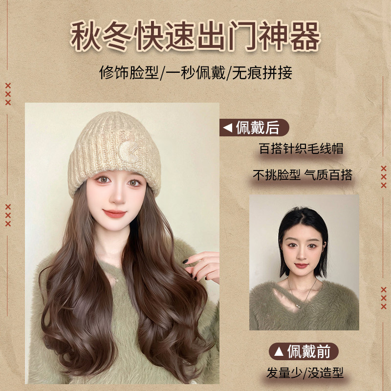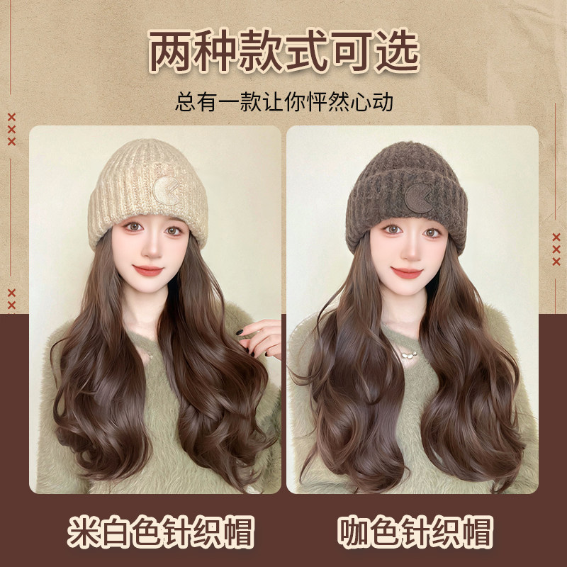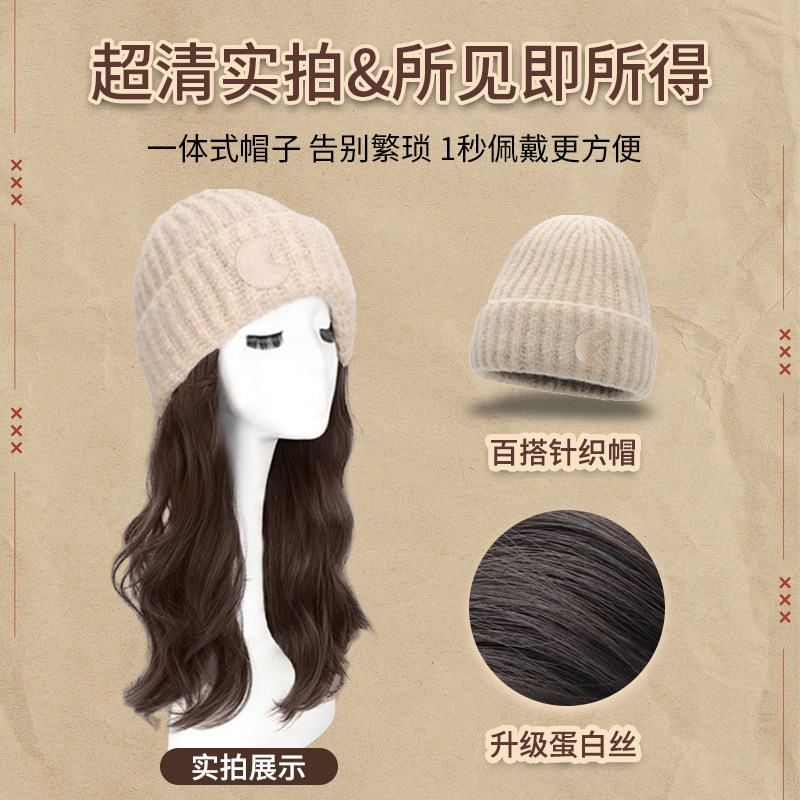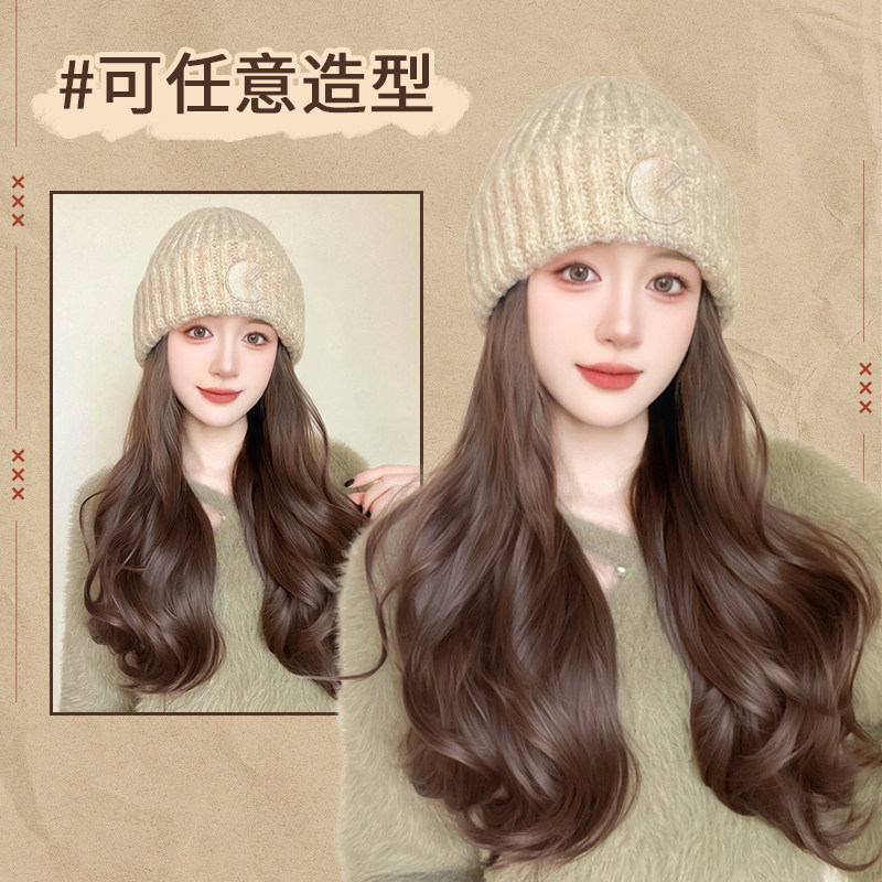 Rice white knitted hat (cold brown) large wave rice white knitted hat (cold brown) wool rolled rice white knitted hat (cold brown) micro internal button rice white knit cap (cold brown) long straight hair