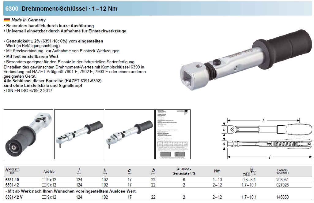 German HAZET 6391-12 Preset torque wrench Jack 9x12mm 2-12Nm production line operation