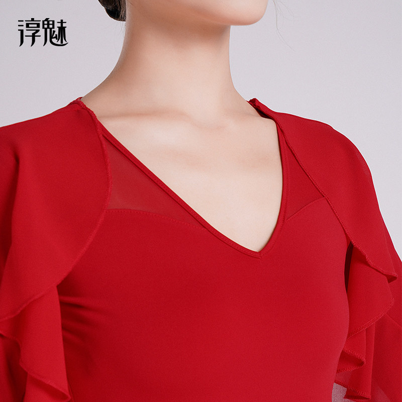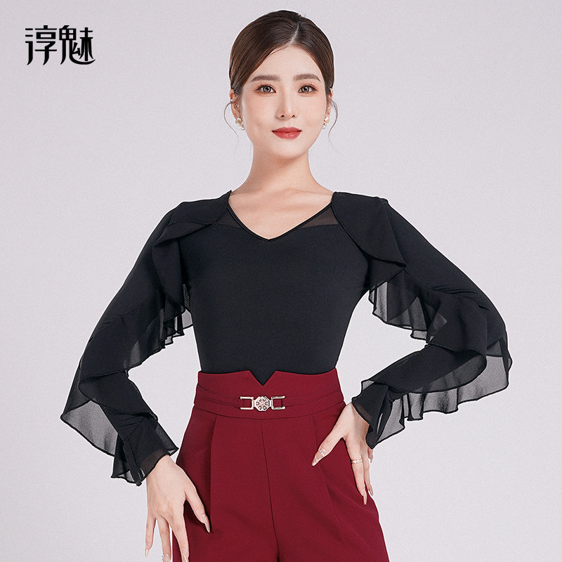 Morden Dance Dress Women Adults Ballroom Dancing lotus leaf Dancing Blouse Waltz V Collar Long Sleeve Dance Clothes 1049-Taobao