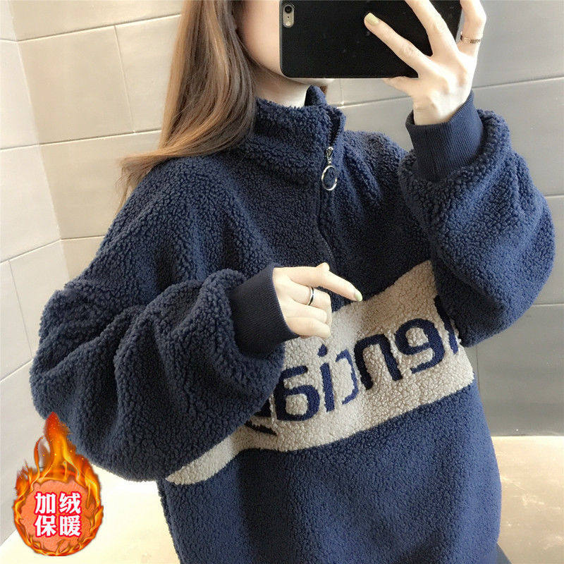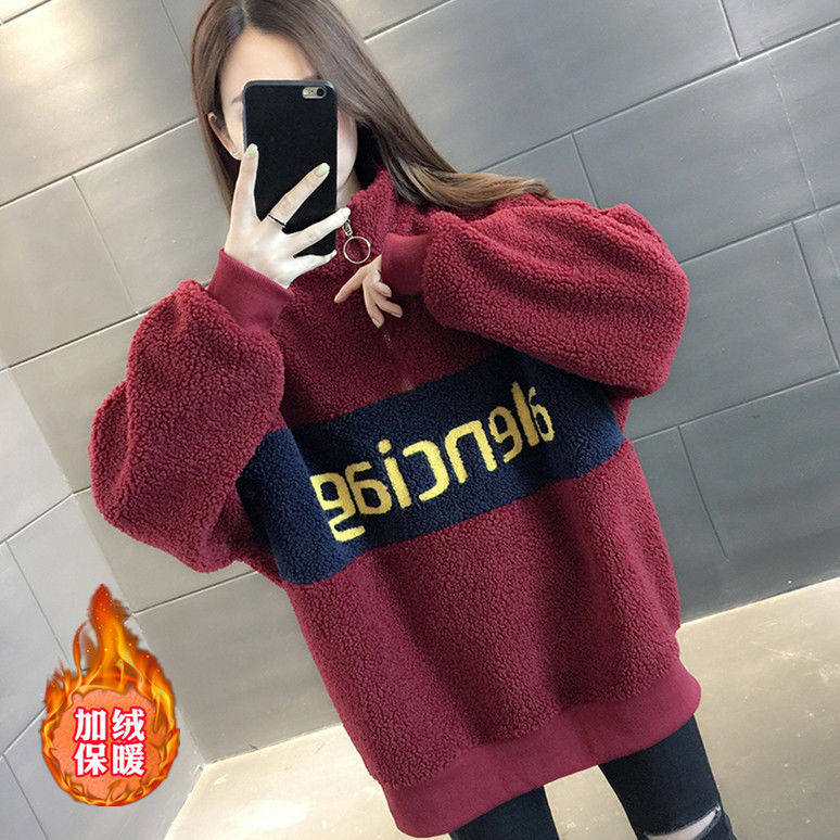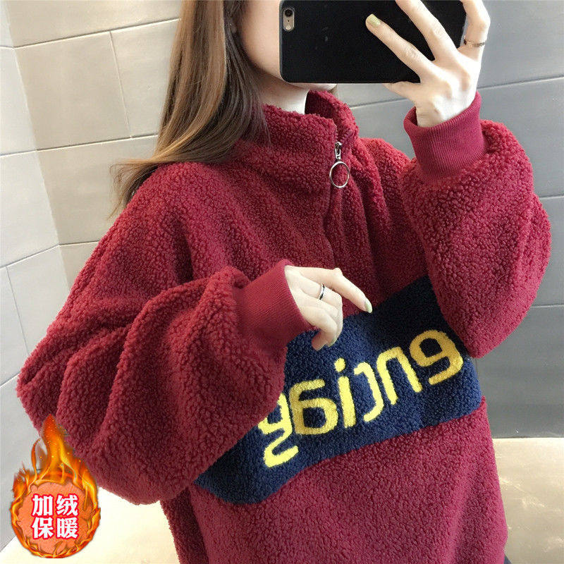 (Garnapped thickened) lamb sweatshirt woman 2024 autumn winter new Korean version loose mesh red warm blouse jacket-Taobao
