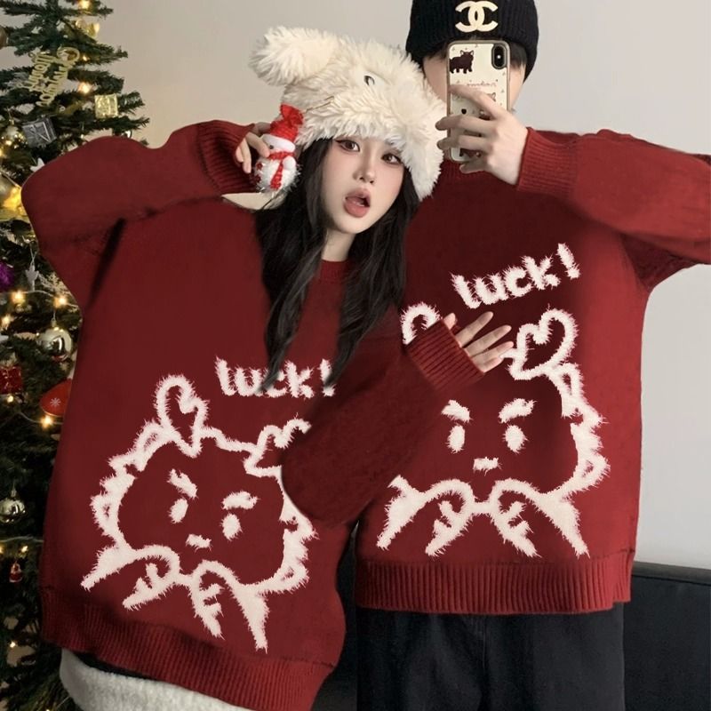 2024 New Year's lovers loaded with two pieces of red sweater winter dragon year Thickened Knit Cardiovert Coat Man-Taobao