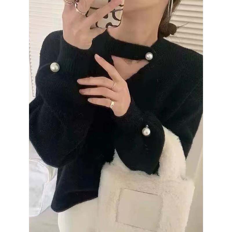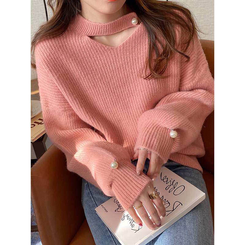 Gentle wind pearl hanging neck soft glutinous sweater women's autumn winter 2023 new lazy thickened design feel knit undershirt-Taobao