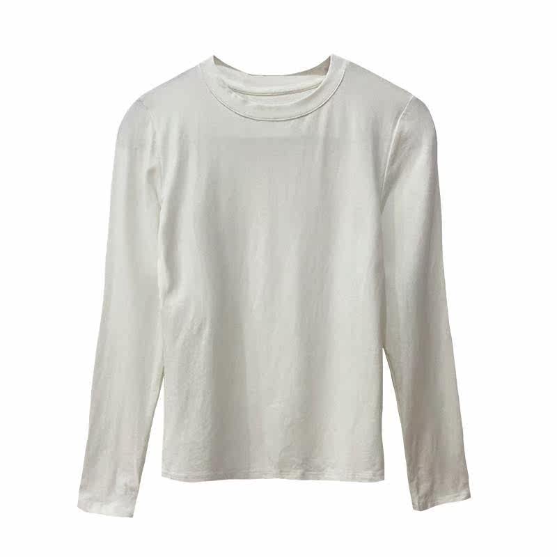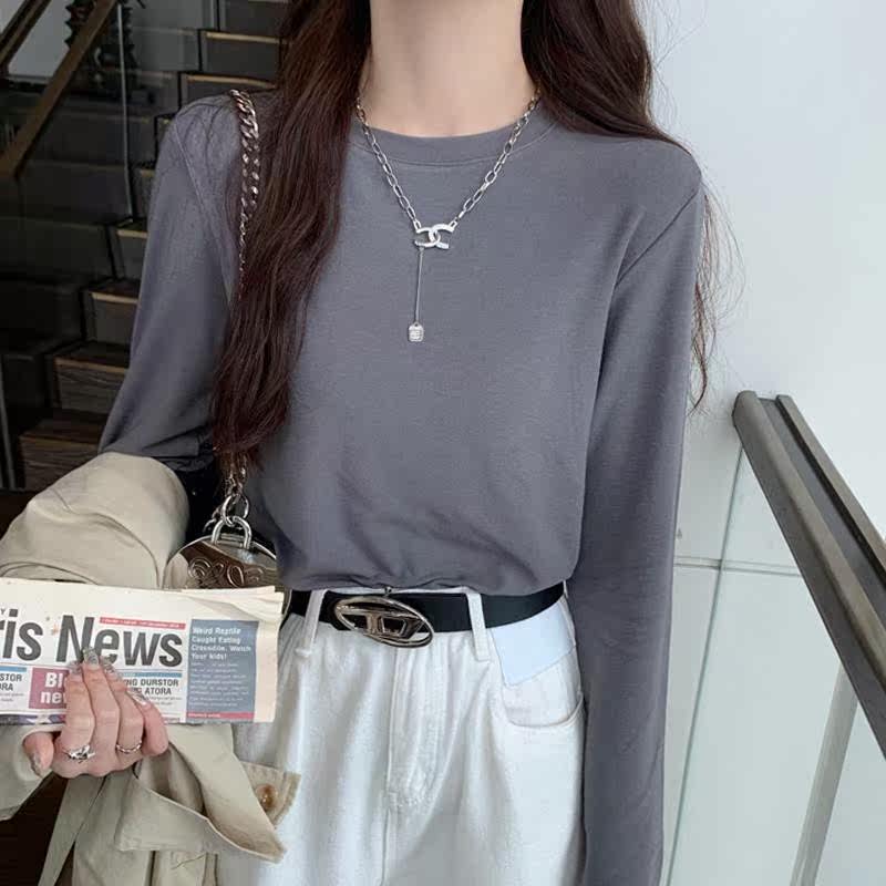 Long sleeve blouse Women's 2023 new fall positive shoulder curl modell hit undershirt with a round collar t-shirt-Taobao