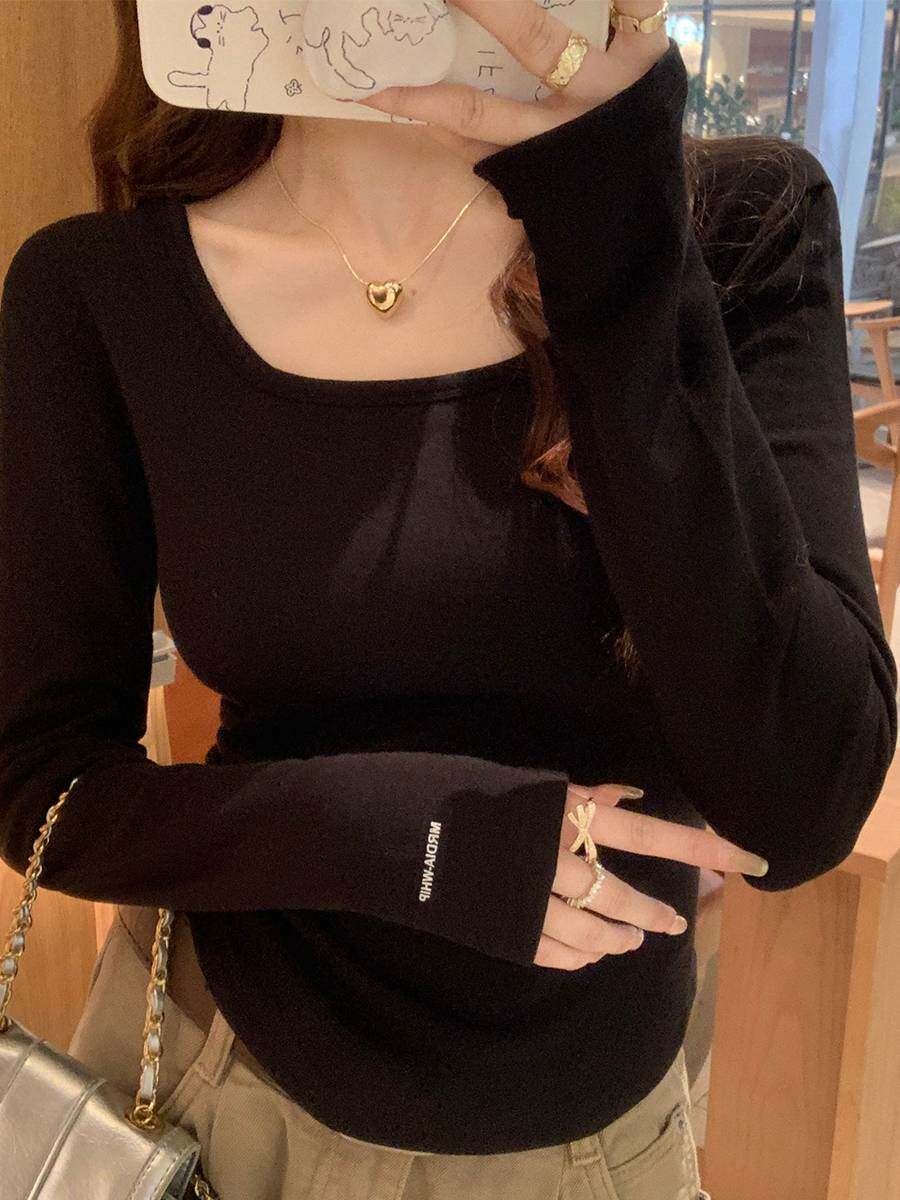 Square Collar Undershirt Woman Autumn Winter 2023 New white plus velvety hairy long sleeves Senior sensation blouses-Taobao
