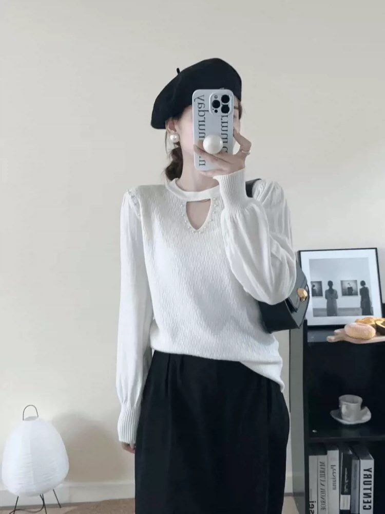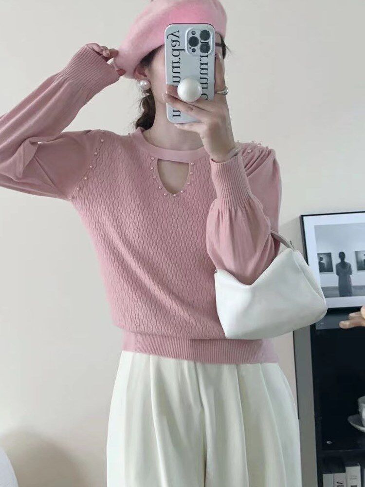 Careful machine needle cardiovert woman long sleeve blouse 2023 fall new round collar loose fashion foreign air slats sweater-Taobao