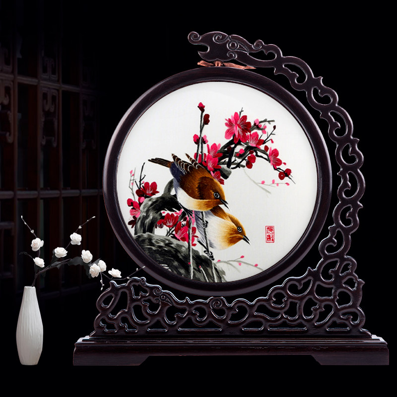 Chengdu characteristic Shu embroidery hand-embroidered national treasure double panda peony chicken wing wood faucet frame double-sided embroidery conference gift