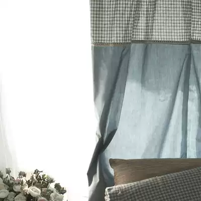 Blues plaid pattern cotton and linen half curtain custom Korean Mediterranean style American countryside custom mosaic curtain