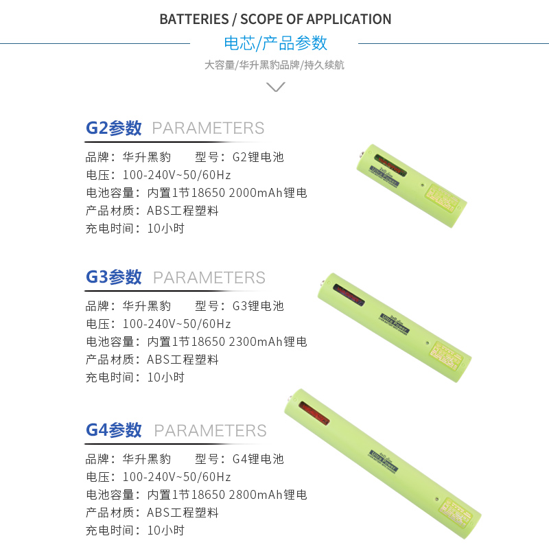 G2 model (3 7V2000MAH lithium battery) G3 model (3 7V2300MAH lithium battery) G4 model (3 7V2800MAH lithium battery) G4 model (3