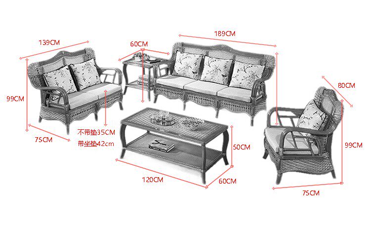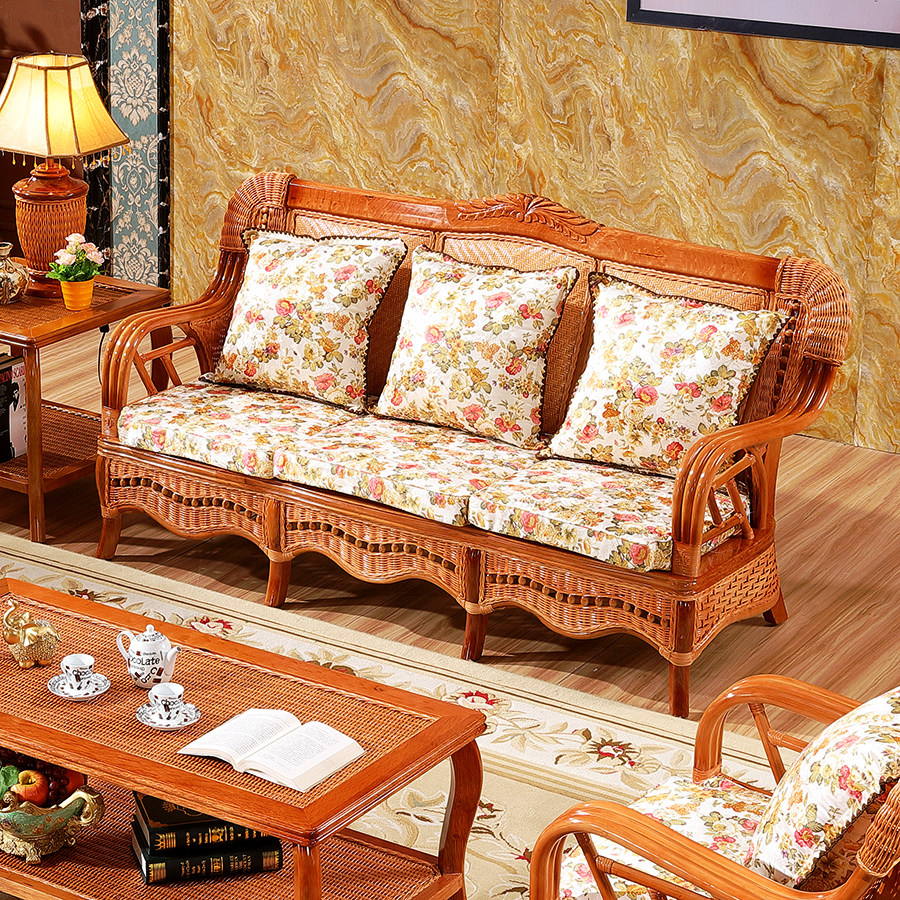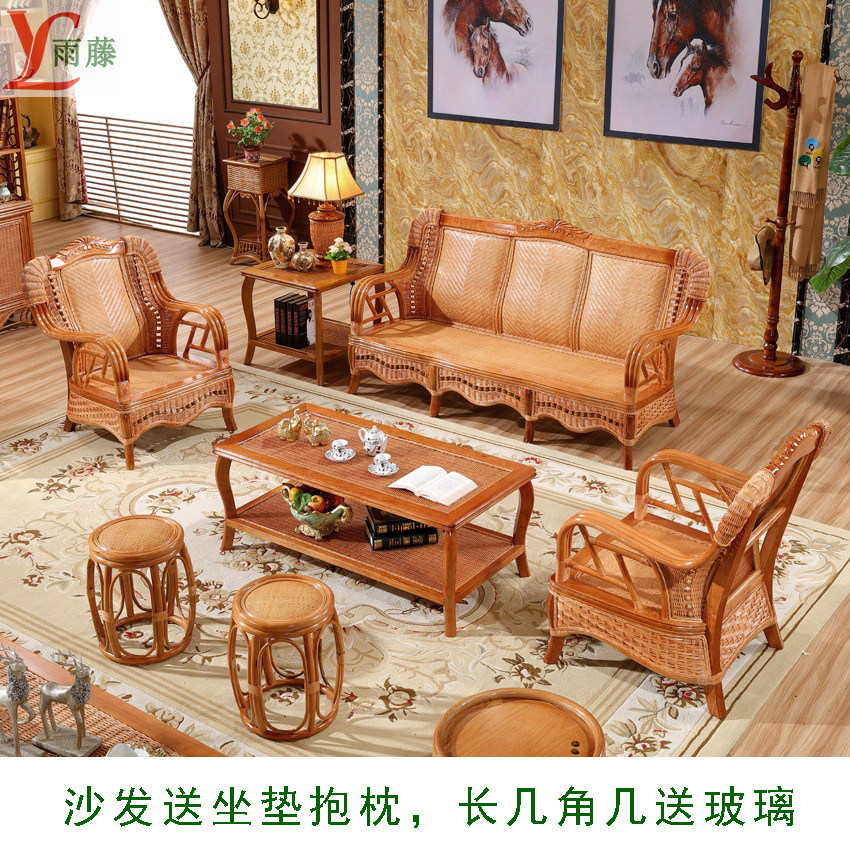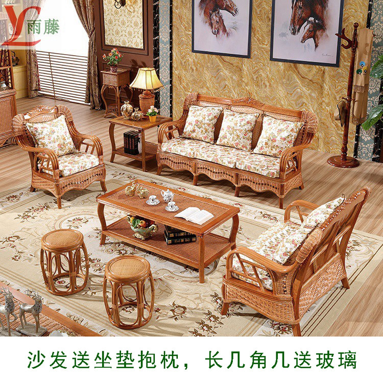 Real rattan wood sofa rattan chair five-piece set chaise longue living room combination rattan weaving art two or three persons sofa bed furniture