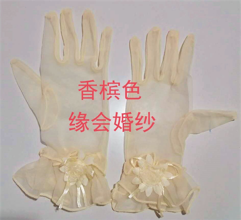 Bridal wedding dress short milky white champagne gloves Thin gloves with fat and flowers transparent mesh