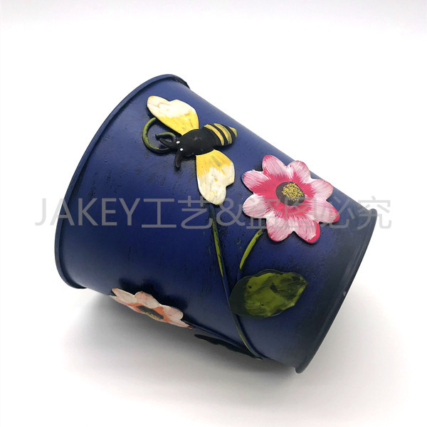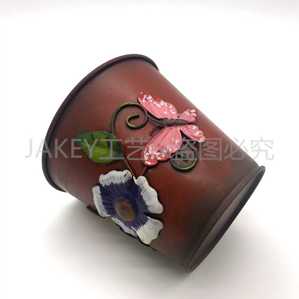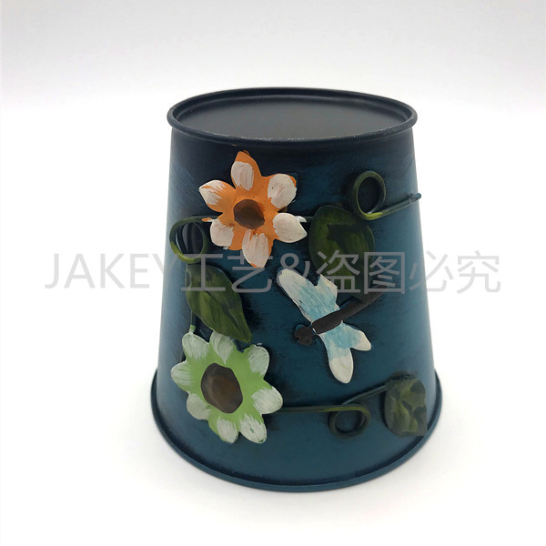 Classic Solid Iron Art Appliquet Colored Drawing Small Iron Barrel Fashion Flower Basket Colorful Flower Pot Vase