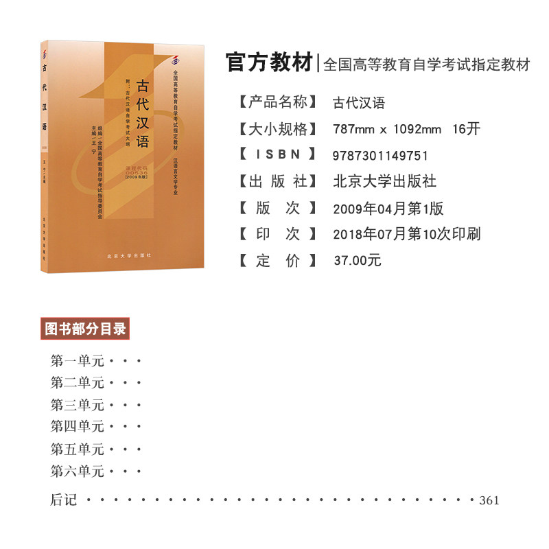 Preparation for examination 2022 New genuine self-examination teaching materials 00536 0536 Ancient Chinese (episynopsis) Wang Ning's 2009 edition of Peking University Press Self-study examination Books To