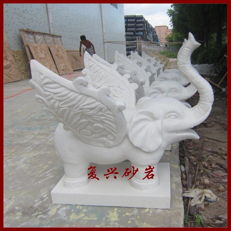 Revival Sandstone Water Jet Small Flying Elephant Fountain Relief Round Carved Landscape Sculpture Glass Fiber Spray Pool Thai Elephant