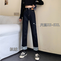 Dark straight jeans women's loose little man 2021 autumn and winter flanging Slim Plus velvet high waist pipe pants