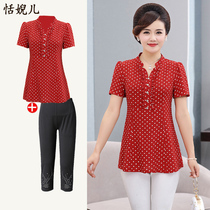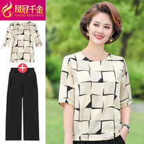 Mom summer suit Western style short-sleeved T-shirt two-piece set middle-aged women's small shirt fashion middle-aged chiffon shirt top