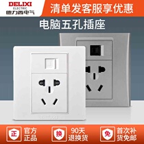 Delixi five-hole computer socket Category 6 Gigabit Category 5 network cable plug into 5-hole gray power panel