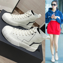 Hong Kong high-top small white shoes women 2021 autumn and winter New Korean version of Joker flat street shoot ins trendy shoes leather Board Shoes