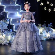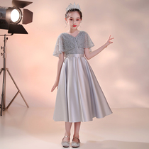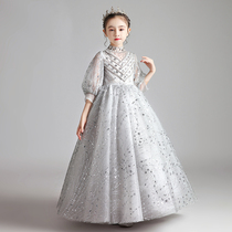 Children's princess dress high-end host model catwalk costume silver gray long piano performance dress girl