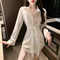 2021 autumn new royal sister style fashion temperament niche light satin polo collar waist long sleeve shirt dress women