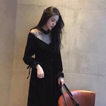 Explosive Hepburn style gold velvet lace banquet base small black temperament waist slim