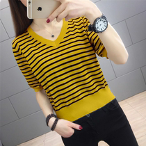 Ice wire striped t shirt tide for wearing short waist short - sleeved 2023 student short - sleeved tops thin hat